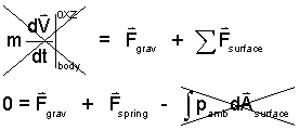Next Newton's Second Law is applied. The momentum is constant, its derivative is zero (left-of-equality). The BODY force is gravity. The surface forces are the pull of the spring and the "float" of the ambient air. We assume the ambient density to equal zero. Hence pressure forces over tht BODY are zero.