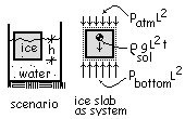 For more information, the momentum equation is applied to a section of ice slab in its initial, floating state. The sketch (right) shows the isolated system bounded by its "dotted line." The momentum equation is applied.