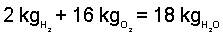 (M = 2.0) react with one oxygen molecule (M = 32) to produce 2 water molecules (M = 18).