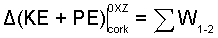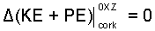Also we might realize that a gravity force acts on the cork and it is displaced. Should this effect be included as work? The answer is no. The work associated with gravity was transformed into an energy term: potential energy. Work is associated with surface forces only ( learning now and explained later). Hence, ignoring the drag force of the cork moving through air approximates the sum of works for the event to equal zero.