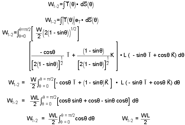 Above, right of equality, is expressed the work of our event in a "force through displacement" form: ∫ F • dX. This term could be calculated DIRECTLY. To do so one would write an expression for the integrand of the vector integral, the tension of the ropes, as a function of angle of lift, T(θ). Next one would write an expression for the vector differential, "displacement of the end of the bridge, dS(θ)." Placing both expressions in the integral, one effects the dot product, then integrates to have the result. Direct calculation of extrinsic work can be tedious.