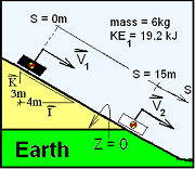 Consider a block of mass 6 kilograms. The block was first observed moving down a frictionless plane with a kinetic energy of 19,200 Joules, State (1). We set the time (the moment of first observation) to be, t = 0+. The coordinate "S," is added to denote distance down the plane.