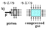 The term to the right is to be established. The gas, as system, is shown to the right in Figure b). In keeping with work being a force times a displacement the force for the gas is defined to be the pressure-force, pressure of the gas at the piston face times piston area. This force acts through a displacement. Representing compression work as an integral, we have: