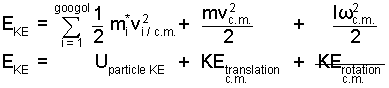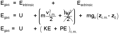 Kinetic energy has a rotational part which is relevant with many systems. We have placed a strike-through on those terms not because they are zero but because this writing will not consider that aspect of energy. In a similar but more abstract manner gas particle potential energies can be divided into extrinsic, "center of mass," and internal components. In conclusion the energy of a gas is written.