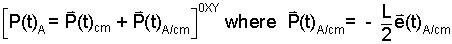 Particle "A" is located and moves in the plane-0XY. The position of "A," referenced to the position of the center of mass of the A-B particle pair is written in general, Eqn-13. The relative velocity component (subscripted A/cm) equals the distance L/2 times a unit vector directed from the center of mass (of the pair) toward "A." That position vector is represented Eqn-013 - right.