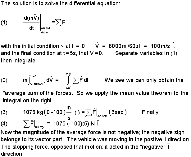 As a driver in a car traveling at 60 km/hr approaches an intersection, the light suddenly changes. The driver applies the breaks until the car stop. If the vehicle (plus driver) mass is 1075 kilograms and the deceleration is constant over the 5 seconds of stopping, calculate the average force that acts at the points of tire-to-road contact.
