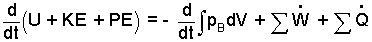 To the right, across the equality, the atmospheric work term, - d(∫dV)dt, is zero because the volume of the elevator (system) does not change. (Bypass ΣW for now). The sum of heats for the event is assumes zero at the beginning of the event and there is no motive for heat change thereafter; ΣQ = 0.