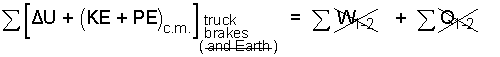 With work, stopping forces will occur where the tires meet the road, but assuming the truck does not slide, those forces are not displaced and there is no work. Seen in another way, the tires do not tear up the road - hence no work. Also, with this first calculation we assume the truck is traveling with the wind so there is no wind drag and no work associated with wind forces. Hence, in our equation, for the event, both work and heat are zero.
