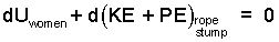 The kinetic and potential energy changes of the women are negligibly small and the internal energy of the ropes and stump will change, inconsequentially, with each event.