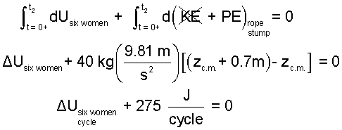 ♦ We defined the system to be the six women, the ropes and the stump; taken together. The steady "horsepower equivalent" of the compactor will equal the average rate of energy expenditure of the women which will occur during the lifting portion of each cycle. There is no work for this effort because the women, ropes and stump are interior to the system. The women will perspire but we assume the heat to be small. The rate-form energy equation reduces as follows: