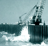 Sheet piling are used to construct temporary barriers in waterways to put in bridge footers, lay fuel lines and such. Once placed, the longer those piles remain (especially in salt water), the greater the headache they are to remove. Worth salvage, the embedded piles must come out, one at a time with their connecting edges intact. By watching a load gage mounted on the drag-line boom, experienced operators can decide when salvage is worth the wear that removing them will put on the lifting machine. Sometimes the piles are pulled and scrapped.