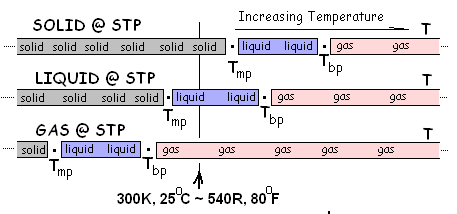 As an introduction to phases consider the conditions of general substances at the relevant pressure, 1.0 atmosphere. There are three basic behaviors as temperature changes. These are differentiated by the initial condition, that of the substance at standard temperature.