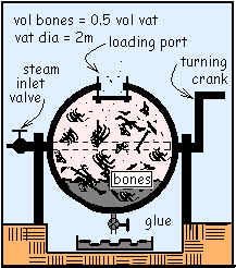 Yardley used a spherical vat with hot high-pressure steam to render animal bones into glue. The vat was filled with bones, fat and cartilage. Steam was admitted to purge the air, then the vat port cover was pulled snug. The vat was charged with steam to 250 kPa and 500°C then rotated slowly. It usually took about an hour for the steam to cool until the pressure in the vat became one atmosphere whereupon the port cover would pop open. Then the glue was drained into the sump and the process was repeated.