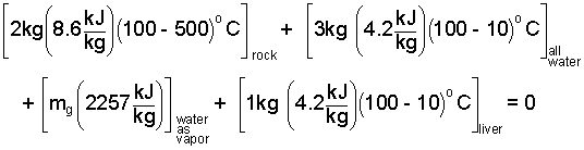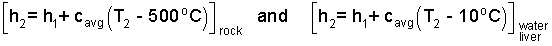 The second temperature will surely be less than 500°C. The first term, the energy change of the rock, is negative, as it should be - the energy of the rock decreases. Also the "water plus liver" term is positive. We can put numbers in this now.