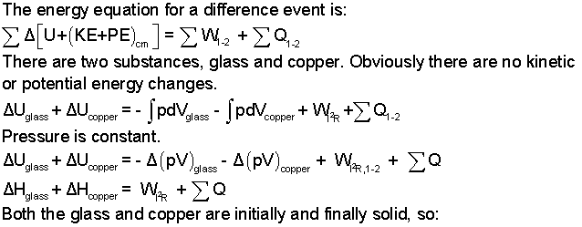 Observe the last equation (above) of our solution. We see the amount of electrical resistance power, I2R, cannot be calculated because we do not know the sum of the heats. To calculate the sum of heats requires knowing temperature differences of the glass and copper in time, the surface area of the glass and some other experimental numbers. Those are topics of heat transfer. Since the glass and copper get hot, there will be heat and it will be (negative) to the surroundings. Consequently our answer based upon the assumption of no heat will be smaller than actual whereupon the actual electrical power must be: