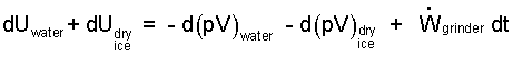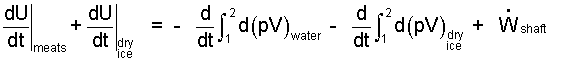 We inspect the energy equation, term by term beginning with the Σ at the left. That summation applies because two substances pass through the grinder. The internal energies of the dry ice, Udry ice, and meats, Umeat, will change. However, we expect inconsequential (center of mass) changes of kinetic or potential energy for the dry ice and meats (water) (X). Zero extrinsic energy change also means zero extrinsic work (X). We write the rate of "compression work" as two pieces - one for dry ice, the other for the meats. There is a single shaft work, that of the grinder motor. This leaves frictional work and the sum of heats. Both frictional work and heat will increase the amount of dry ice needed - we assume frictional work and heats are negligibly small (/).