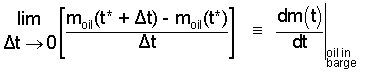 The teachings of Newton (and/or Leibnitz) are now applied as we "take the limit" of the quotient as Δt → 0. The resulting form is the pivotal entity of calculus, the derivative. In this case the derivative represents physically the rate rate of change of mass in the hold.