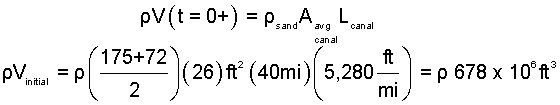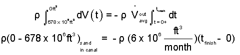 Next we apply integration operators. The lower limits (both integrals) are associated with the initial state of the canal and the initial time of digging. By the calculation below we know the initial volume of sand the is 678 million cubic feet; this is the lower limit of the left-of-equality integral and the lower limit of the integral right-of-equality is the time, t = 0+.