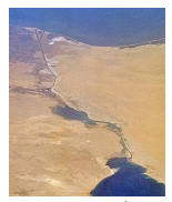 The Suez Canal was dug across 40 miles of desert by a team of dredges. The canal initiated in a lake at its north end. It was "dug" by pumping a water-saturated sand mix (slurry) from the canal to a bank about half a mile away. The average rate of sand removed by the digging machines was six million cubic feet per month. The figure shows a pictoral view of the completed canal and a sketch of the canal average profile.