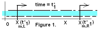 It is logical to identify a 1-D system as being that mass of fluid bounded by material coordinates ("m"). The "left" coordinate is notated "m,L" and "m,R" is the "right" coordinate. These coordinate points move in accord with the physics of the fluid. Assume the fluid incompressible and ideal; having no velocity profile (slug-flow). Let the selection of system occur at time "t*1".