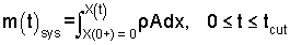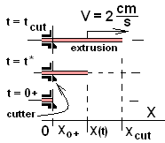 We take the system of one "extrude and cut" event to be is the length of mass extruded. The sketch to the right shows that mass at three times of its event. Inspected the figure from bottom to top. At t = 0+, an instant after the previous cut, the system mass equals zero. Above at an arbitrary time, t = t*, the length of the system mass equals X(t*) and finally (above again) at t = tcut, a mass of 100 grams has been extruded, so it is cut. We write the system mass as an integral with a variable upper limit, X(t).