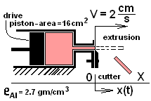Aluminum exits from an extrusion die at constant speed of 2 centimeters per second and a cross-sectional area of 3 square centimeters. Once the extrusion is established, a cutter actuates regularly to chop the exiting aluminum in lengths that have a mass equal to 100 grams. The sketch shows the process at the instant (t = 0+) a section was cut. That is: