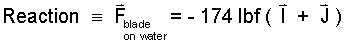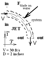 Force of Water on Blade: A common next step is to determine the force of the jet of water on the blade. Our system analysis provided the force of the blade on the water, therefore the negative of this force equals the force of the water on the blade.