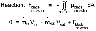 In the next equation we express the integral of pressure over surface of the system any point on the system surface as being caused by atmosphere (see the figure above) or the blade. The entering and exiting flows are free jets. Consequently the pressures across the entrance plane and exit plane are atmospheric. The contributions of atmospheric pressure-force over the entire system surface sum to zero.