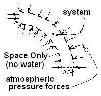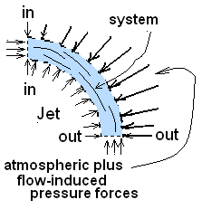The first step is to visualize the space the water passes through but without any moving water in that space. Think of it as "before the water jet is turned on." This tube-shaped space contacts the blade that water will pass through once it flows. This elbow-shaped tubular volume, our system "before the water flows," is drawn to the right. The sketch shows small pressure-forces that act on the system boundary as a consequence of the surrounding atmospheric pressure. The integral of this distribution of pressure-forces over the surface equals zero - the space is in equilibrium.