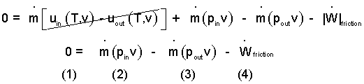 The resulting equation has four terms. Term (1) has the numeric value "0." The thermodynamic meaning of this "0" is the system energy is constant in time. Also and obviously, the "0" means the right-of-equality terms sum to zero. Terms (2) and (3) represent energy entering and leaving the pipe with the mass flow. More energy enters than leaves. Energy is dissipated frictionally (internal mechanical equilibration) as it flows.