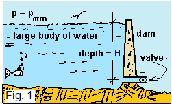 A scenario for this proof is a reservoir of water that extends a great distance to the left (Fig 1: Section View). Water is constrained by banks, one close to us, the other at a distance into the page (not shown). On its right the water is constrained by the left face of a dam. Near the base of the dam, a depth of "H" feet below the water surface, a pipe with a valve passes through. While the valve is closed, water does not flow. Upon opening the valve water flows from the reservoir through the pipe to space at the right.