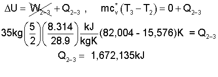 ♦ Heat of Lift: States (3) to (4) The volume of air will increase to 32.64m³ as the air pressure remains constant. Thus we know the conditions of State (4) (30kg, 32.64³, 27,523kPa and T = T4. We might calculate W3-4 independently. However let's apply the energy equation and obtain work and heat together.