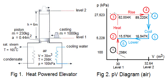 By inspection of the schematic we understand elevator operation will be five steps. A p-V diagram for the air is needed. States of the air are determined as the p-V diagram is sketched: Figure 2.